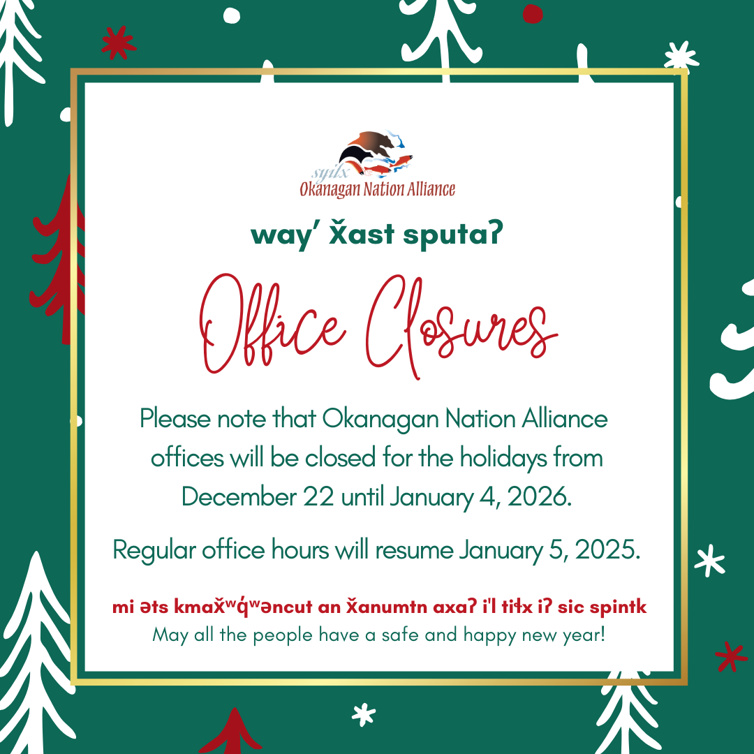 Please note that Okanagan Nation Alliance offices will be closed for the holidays from December 22 until January 4, 2026.