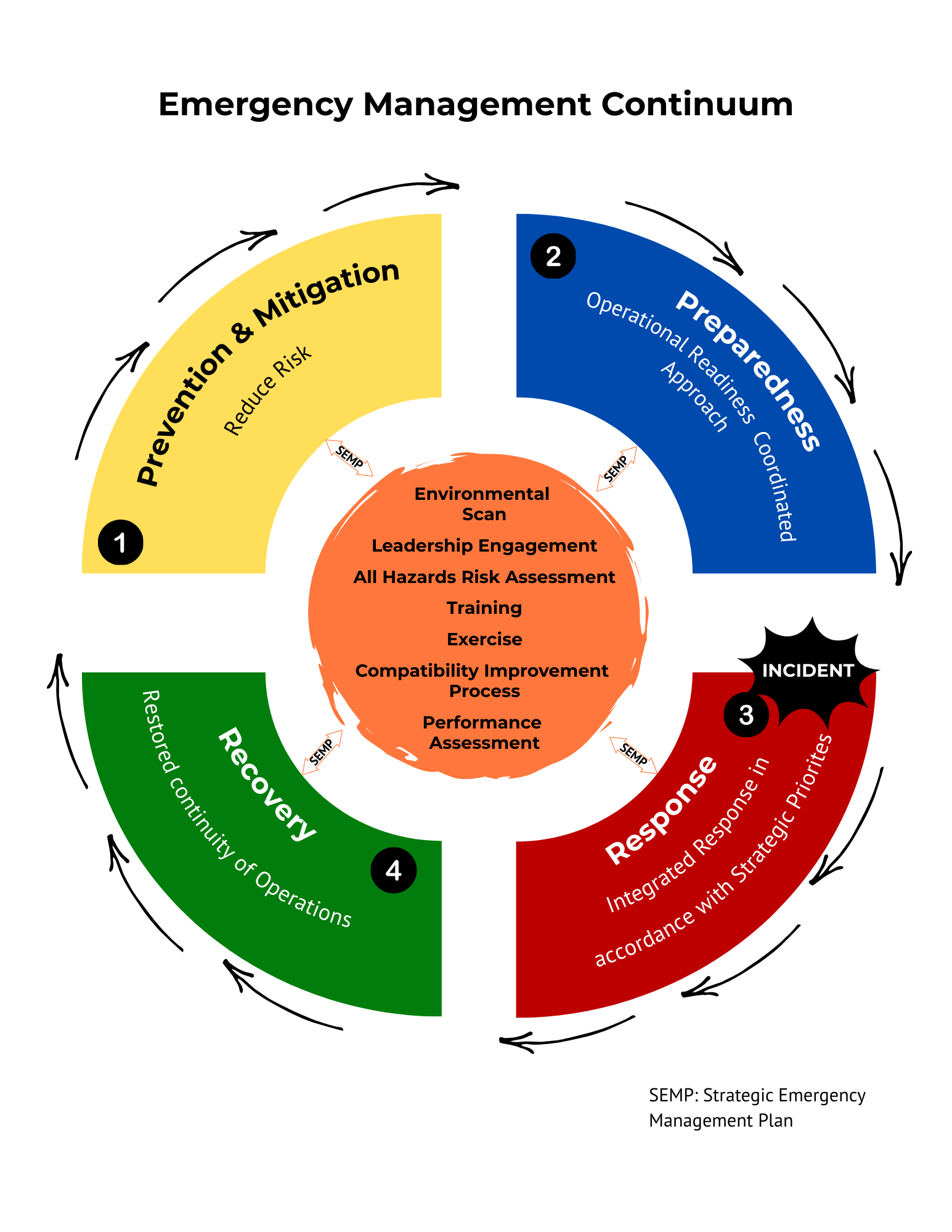 An emergency can be any event, such as severe weather, wildfires, flooding or drought, infrastructure failure, or even a digital/IT incident, that requires a prompt, coordinated response to safeguard people and minimize harm. This is guided by four key pillars: